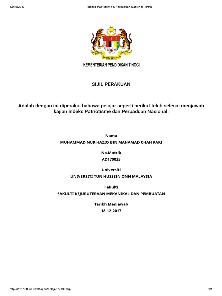 Salam sejahtera dengan segala hormatnya dimaklumkan bahawa sistem penilaian indeks patriotisme dan perpaduan nasional ippn telah dibangunkan bagi.