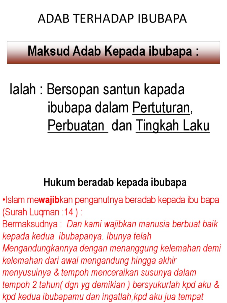 Adab terhadap ibubapa sebagai seorang beragama islam kita wajib mentaati kedua ibubapa dan menjaga ibu bapa dengan penuh kasing sayang. Perkataan ibu bapa ini begitu sinonim di dalam sesebuah institusi keluarga. Norizan binti sulaiman d20102046231. Ibubapa adalah orang yang paling hampir dengan kita dan banyak berjasa kepada kita.