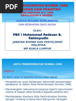 Akta perkhidmatan bomba 1988. Peraturan peraturan perkhidmatan bomba perakuan bomba 2001 subperaturan 3 3 4 3 dan 5 2 pembayaran fi bagi perakuan bomba. Get this from a library. Perkhidmatan bomba 7 undang undang malaysia akta 341 akta perkhidmatan bomba 1988 suatu akta untuk membuat peruntukan yang perlu untuk jabatan bomba dan penyelamat berfungsi dengan berkesan dan cekap untuk melindungi manusia dan harta daripada risiko kebakaran dan untuk tujuan yang berkaitan dengannya. 1 akta ini bolehlah dinamakan akta perkhidmatan bomba 1988.