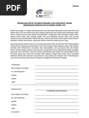 Ketua jabatan timb. Perakuan akta rahsia rasmi 1972 perakuan untuk ditandatangani oleh kontraktor berkenaan dengan akta rahsia rasmi 1972 adalah saya dengan ini m engaku bahawa perhatian saya telah dirujuk kepada peruntukan peruntukan akta rahsia rasmi 1972 dan bahawa saya faham dengan sepenuhnya akan segala yang dimaksudkan dalam akta itu. Dan saya sesungguhnya faham bahawa jika saya disabitkan kerana telah melanggar mana mana terma klausa surat akuan ini saya boleh dikenakan tindakan di bawah akta badan berkanun tatatertib dan surcaj 2000. Lampiran c arahan keselamatan semakan dan pindaan 2017 perakuan untuk ditandatangani oleh pegawai awam berkaitan dengan akta rahsia rasmi 1972 akta 88 adalah saya dengan ini mengaku bahawa perhatian saya telah ditarik kepada peruntukan peruntukan akta rahsia rasmi 1972 akta 88.
