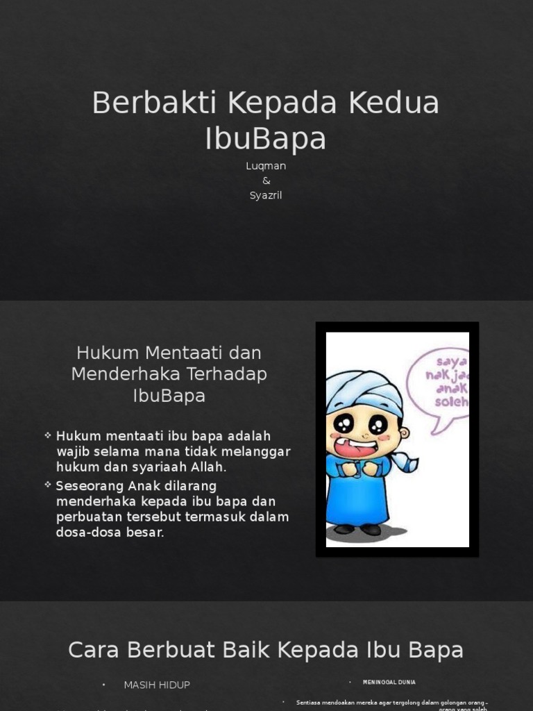 Jangan menyesal dihari akan datang apabila ibu bapa tiada lagi disisi. 1 memberi kasih sayang. Melakukan perkara yang tidak sukai ibu bapa bermakna melakukan perbuatan derhaka. Ibu bapa sudah tentu mengharapkan anaknya melakukan sesuatu yang baik pada pandangan mereka.