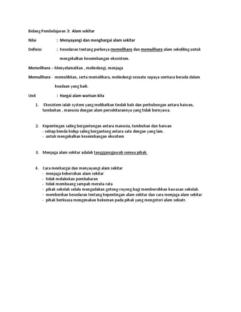 Pada pendapat saya semua pihak mesti berganding bahu untuk menjaga kebersihan alam sekitar. Tanpa pemusnahan hutan ia dapat berfungsi sebagai kawasan tadahan hujan. Dan juga kalau sumber daya alam tidak kita lestarikan bisa menimbulkan terjadinya bencana alam. Cara cara memulihara alam sekitar yang seterusnya ialah peranan yang perlu dimainkan oleh media massa sama ada ada media elektronik ataupun media cetak.
