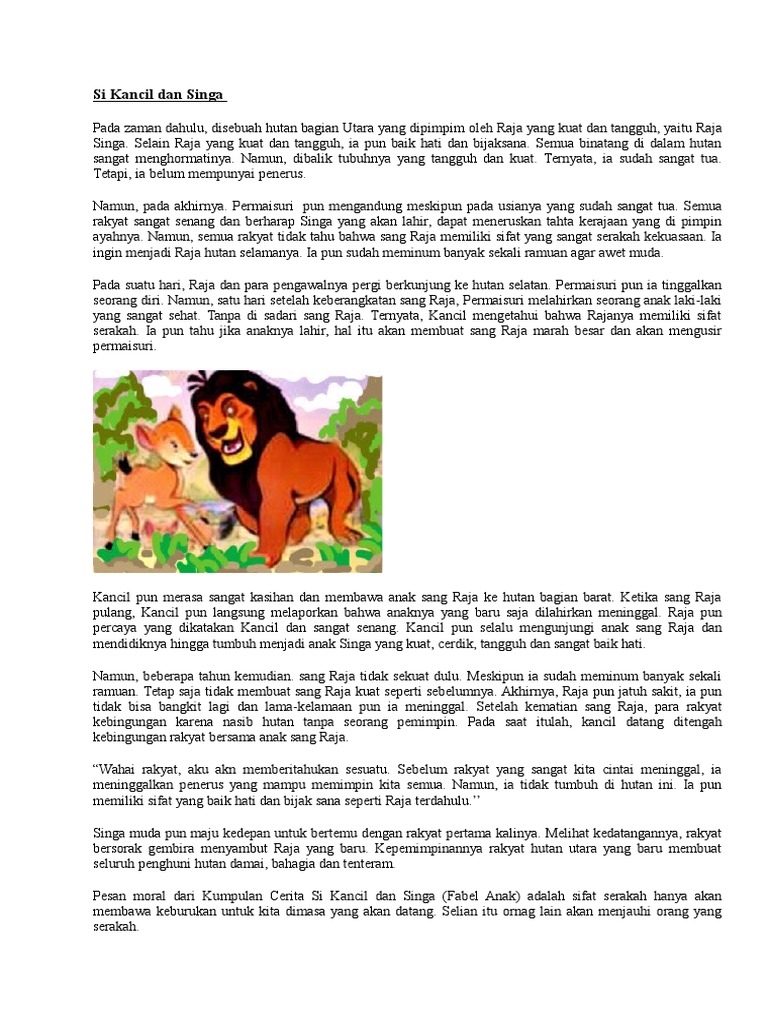 Pada zaman dahulu kala ada seekor kancil yang tinggal di sebuah hutan rimba. Kumpulan cerita si kancil dan singa fabel anak terbaru pada zaman dahulu disebuah hutan bagian utara yang dipimpim oleh raja yang kuat dan tangguh yaitu raja singa. Google image pada zaman dahulu seekor sang kancil telah pergi ke hutan untuk mencari makanan. Banyak binatang binatang di dalam hutan datang kepadanya untuk meminta pertolongan apabila mereka menghadapi masalah.