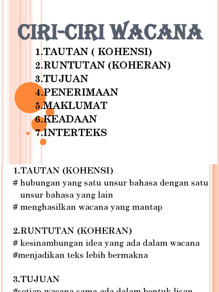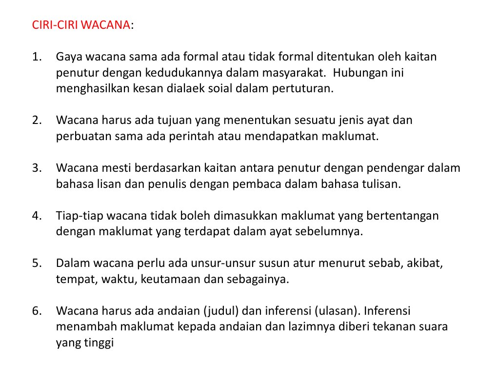 Mempunyai sebuah hubungan kohesi. Sebab akibat oleh sebab dia belajar bersungguh sungguh dia mendapat kejayaan yang cemerlang dan dia telah diberi hadiah penghargaan. Wacana lisan dapat dilengkapi dengan gerakan anggota tubuh untuk memperjelas makna yang dimaksud. Setiap wacana tidak boleh dimaksukkan maklumat yang bertentangan dengan maklumat yang terdapat dalam ayat ciri ciri wacana dalam wacana perlu ada unsur unsur susun atur menurut sebab akibat tempat waktu keutamaan dan sebagainya ayat ayat ini harus mempunyai urutan yang sangat rapat wacana harus mempunyai andaian dan inferensi maklumat pertama dalam wacana digelar andaian manakala.