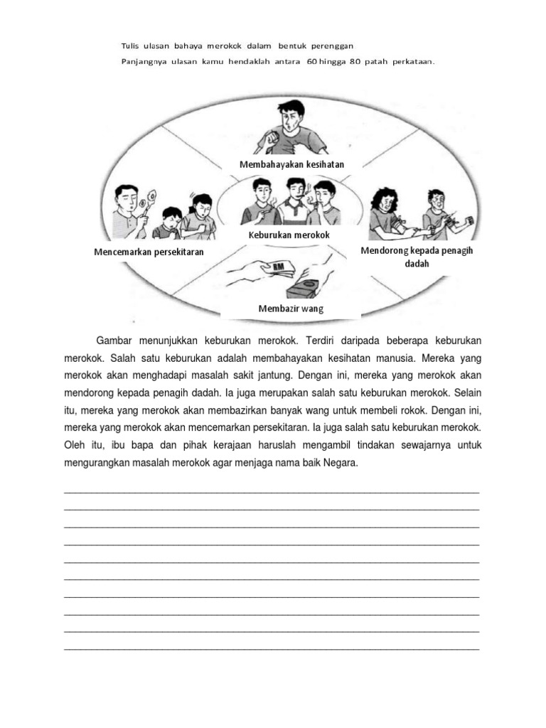Contoh karangan ulasan keburukan merokok. Merokok merupakan tabiat sia sia yang banyak mendatangkan keburukan. Laporan kementerian kesihatan malaysia pada tahun 2000 dalam modul berhenti merokok. Punca punca gejala ponteng gejala ponteng sekolah masih menjadi masalah utama dalam sistem pendidikan di negara kita. Tabiar merokok memudaratkan wajar dihentikan serta merta.