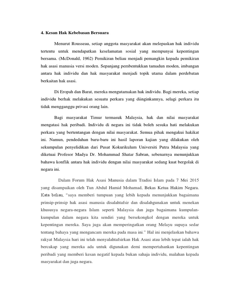 Malangnya ramai di antara pendukung kebebasan bersuara ini gagal memahami impak yang berlaku dalam meraikan kelonggaran yang diberikan. Perkara 18 dalam kovenan antarabangsa pbb tentang hak hak sivil dan politik menyataka dasar yang menafikan kebebasan seseorang untuk mengamalkan agamanya merupakan satu kezaliman rohaniah. English version below suruhanjaya hak asasi manusia malaysia suhakam menegaskan pendiriannya bahawa prinsip kebebasan menyatakan bersuara yang merupakan hak seluruh rakyat malaysia seperti yang termaktub di bawah perkara 10 perlembagaan persekutuan termasuk perkara 19 perisytiharan hak asasi manusia sejagat. Perkataan berbau lucah dan tidak sopan jelas boleh membuat pergaduhan.
