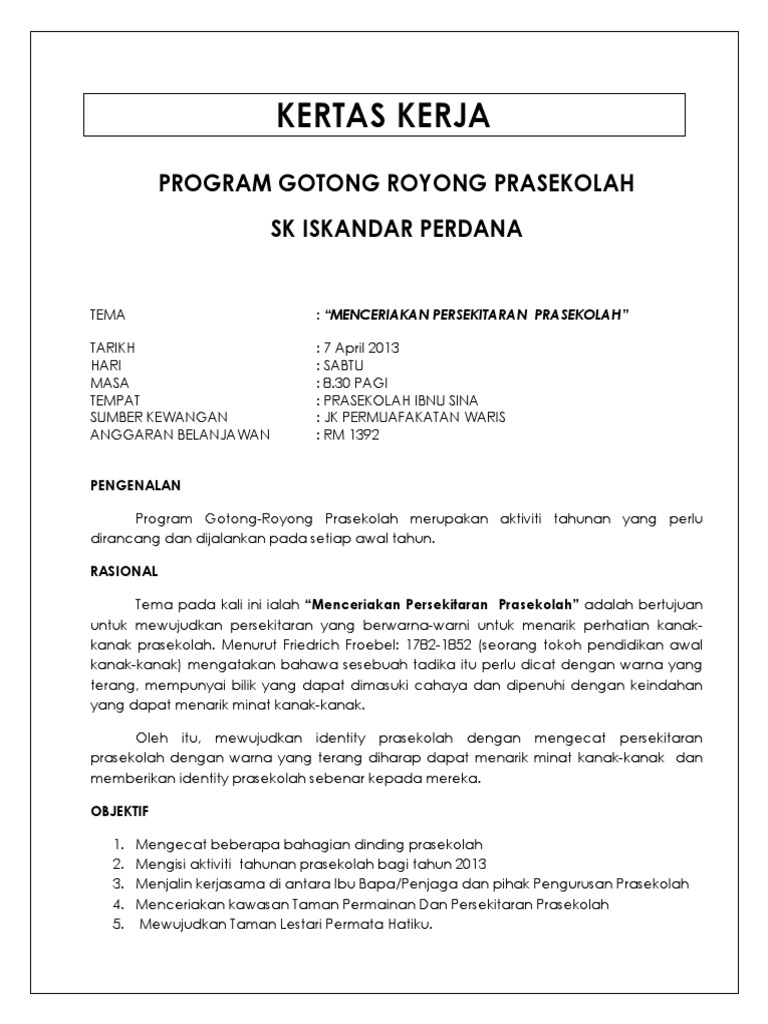 Contoh Kertas Kerja Gotong Royong Prasekolah
