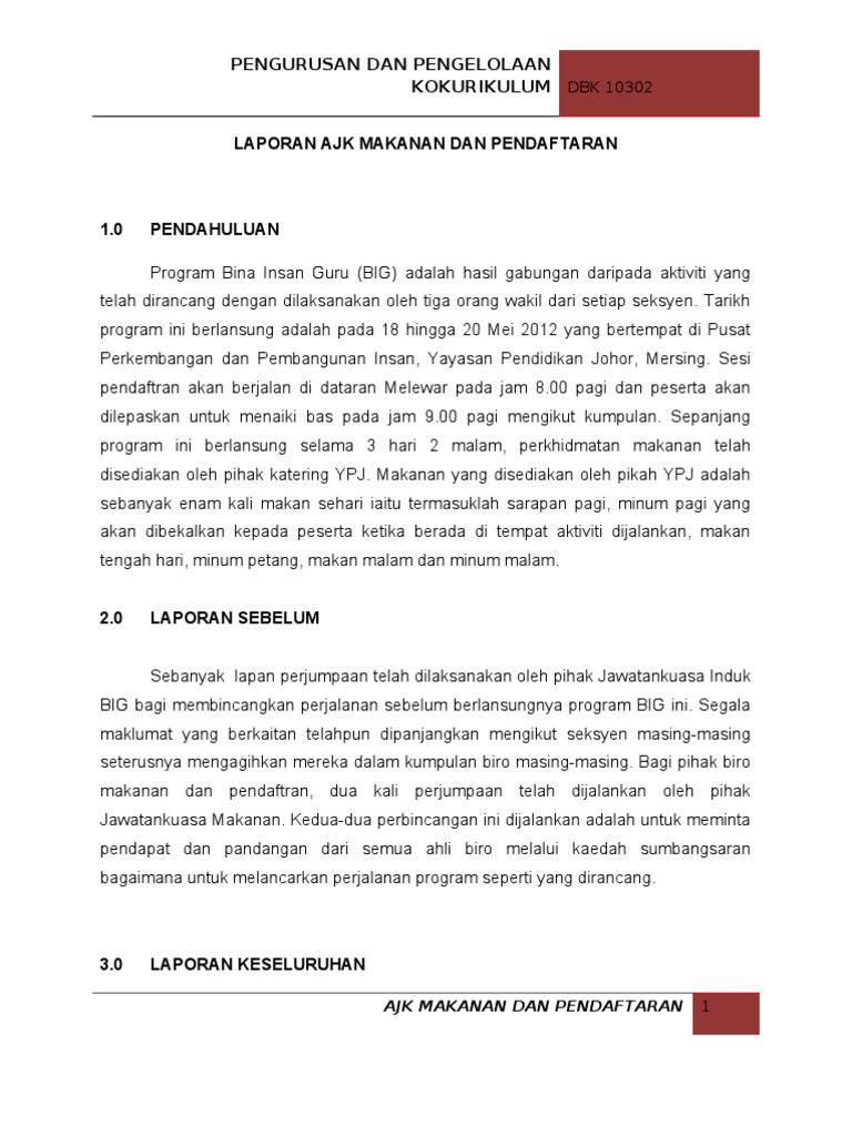 Pada kira kira pukul 12 30 setelah sampai ke jeti pekan kuah barang barang diangkat daripada feri dan dibawa masuk ke dalam bas untuk di bawa ke beringin beach resort tapak perkhemahan program bina insan guru siri ke 16. Laporan post jamuan program masalah penyelesaian sebelum perbelanjaan penyediaan makanan untuk ajk tidak mencukupi. Ajk program contoh contoh ajk program dengan bidang tugas. Laporan kewangan yang lengkap hendaklah dihantar tidak lewat daripada 1 bulan 30 hari selepas tamat program.