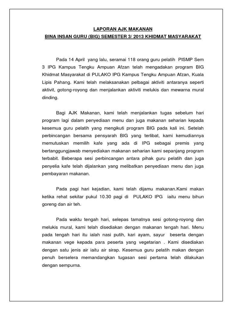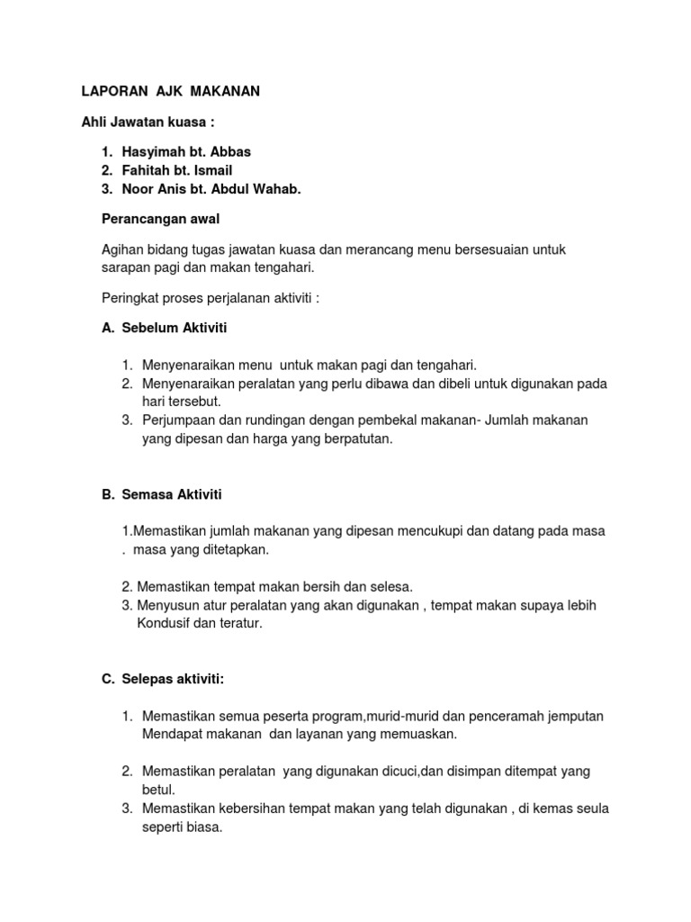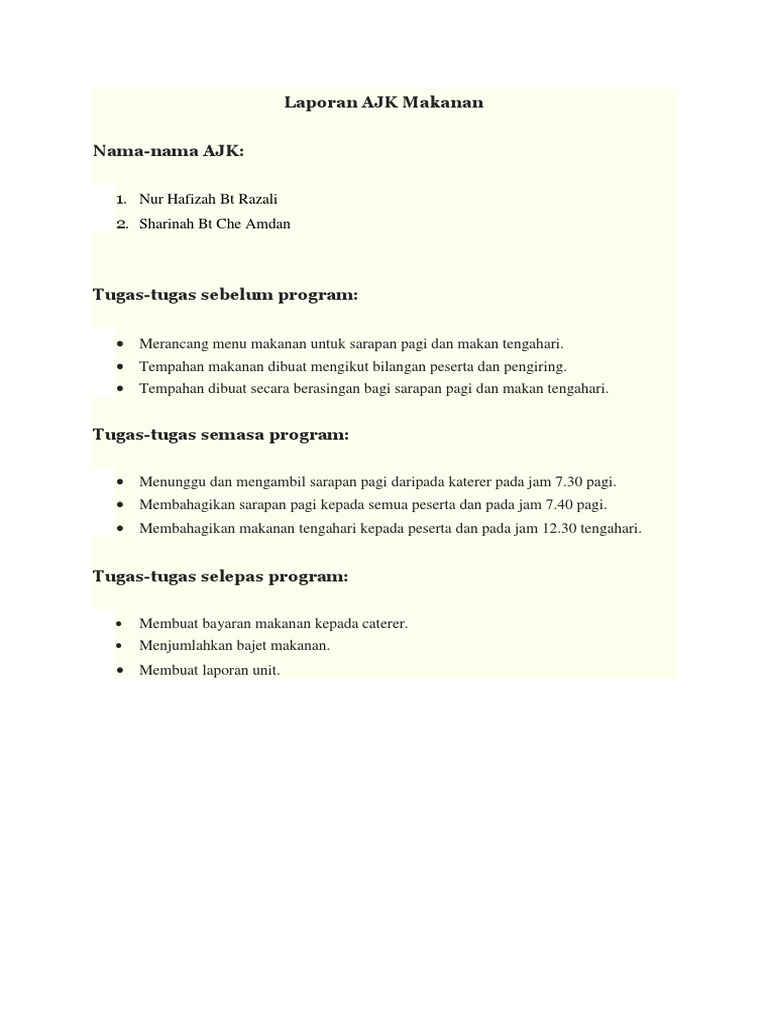 1 zulkarnain bin mustapha 2 mohammad akmal bin zakaria 3 r. Kumpulan contoh laporan ajk makanan. Menguruskan jamuan pada hari perasmian dan penutup. Laporan post jamuan program masalah penyelesaian sebelum perbelanjaan penyediaan makanan untuk ajk tidak mencukupi.