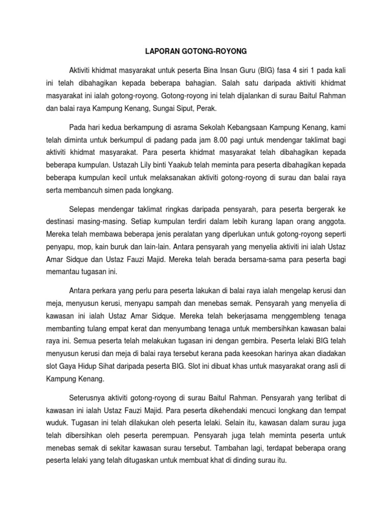 Contoh laporan aktiviti gotong royong. Aktiviti ini melibatkan beberapa persatuan dan kelab antaranya ialah persatuan pengakap puteri islam dan kadet remaja sekolah. Pada pukul 10 00 pagi semua guru dan murid murid menuju ke dewan datuk maharajalela untuk aktiviti seterusnya iaitu aktiviti poco poco. Admin blog seputar laporan 2019 juga mengumpulkan gambar gambar lainnya terkait contoh laporan aktiviti gotong royong dibawah ini. Persekitaran sekolah yang bersih dan ceria dapat membantumempertingkatkan proses pengajaran dan pembelajaran dengan lebih berkesan dan efektif sehubungan dengan itu pihak sekolah melalui jawatankuasa 3k keselamatan kesihatandan kebersihan telah merancang untuk menganjurkan satu aktiviti gotong royong perdanabersama pihak pibg bagi memenuhi matlamat yang telah diterapkan oleh kementerian.