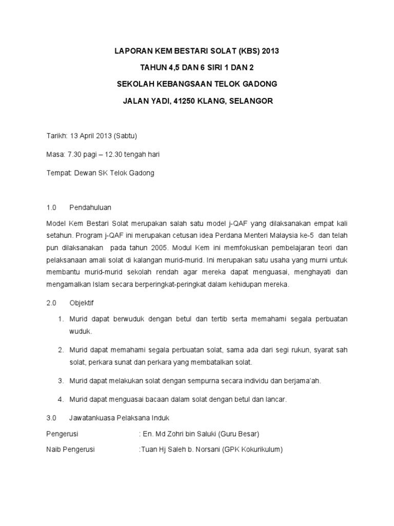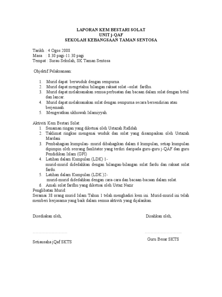 Contoh laporan kem bestari solat. Pk01 pengurusan panitia pk01 3 laporan program 1. Alhamdulilah kem bestari solat bagi murid murid tahun 2 dan 5 telah dilaksanakan dengan baiknya. 15 mac 2014 4. Contoh laporan perlaksanaan kem bestari solat pk01 3.