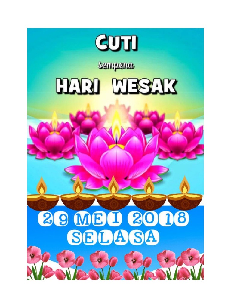Cuti sempena hari wesak. Sempena tarikh permulaan persidangan itu bermula mereka sebulat suara memilih 25 mei 1950 sebagai hari pertama sambutan ulangtahun yang dinamakan sebagai hari wesak. Hari wesak tulisan jawi. Makluman kepada semua warga sekolah kebangsaan desa pandan hari selasa bertarikh 13 mei 2014 merupakan hari cuti umum sempena sambutan hari wesak. هاري ويسک merupakan hari terpenting bagi penganut agama buddha kerana hari wesak melambangkan kelahiran pencerahan agung dan kewafatan gautama buddha hari wesak juga dikenali dengan nama visakah puja atau buddha purnima di india vesak di singapura visakha bucha di thailand waisak di indonesia dan wesak di sri lanka.