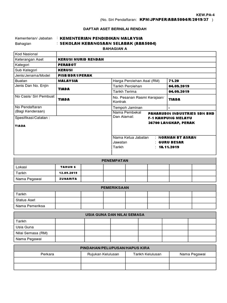 Daftar aset alih bernilai rendah kew pa 4. Ruangan penempatan hendaklah ditandatangani oleh pegawai aset atau pegawai bertanggungjawab di lokasi. Pesanan rasmi kerajaan dan tarikhtempoh jaminan nama pembekal dan alamat. A daftar harta modal kew pa 3 seperti di lampiran a. Kew pa 5 dan kew pa 6 hendaklah dikemas kini apabila terdapat aset alih baharu aset alih dilupus atau aset alih dihapus kira.