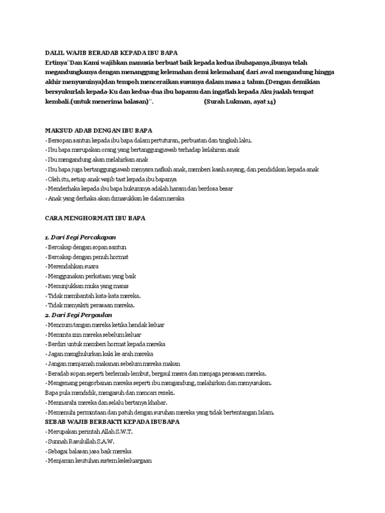 Sesungguhnya allah mengharamkan ke atas kalian berbuat derhaka kepada ibu meminta sesuatu yang bukan haknya dan menanam bayi perempuan hidup hidup. Walau bagaimana pun tanggung jawab untuk mentaati kedua ibu bapa adalah terhad kepada perkara yang halal dan selari dengan ajaran islam sahaja. Anak wajib taat kepada ibubapa dalil al quran maksudnya. Di antara adab yang mesti dipraktikkan sentiasa ialah berlemah lembut dan berbudi bahasa apabila berkomunikasi dengan mereka berbelanja untuk keperluan ibu bapa dan menjaga mereka dengan sebaik baiknya.