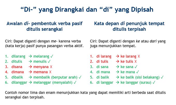 Rasibook 8 09 2018 edit naskah eyd. Di dan ke sebagai kata depan preposisi. Di dan ke dalam bahasa indonesia bisa menempati kata depan dan sebagai imbuhan. Seperti sore ini judul artikel saya berubah menjadi dimana logikanya calon independen diakomodasi pilkada tidak langsung padahal saya menuliskannya dengan di mana logikanya calon independen diakomodasi pilkada tidak langsung saya lupa memberinya tanda tanya.