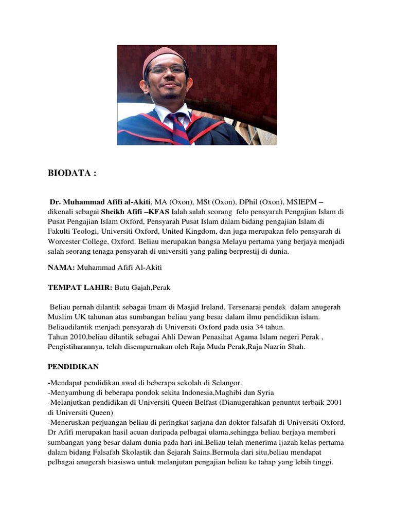 Dr afifi al akiti biodata. Dato dr al akiti s areas of expertise are islamic theology philosophy and science. Dato dr muhammad afifi al akiti ba queen s ma oxon mst oxon dphil oxon msiepm also known as shaykh afifi 1 2 is kfas fellow in islamic studies at theoxford centre for islamic studies 3 and islamic centre lecturer in islamic studies at thefaculty of theology university of oxford 4 and is a fellow of worcester college oxford he is the first ever malay to be appointed. Tidak seperti di malaysia institusi pondok di indonesia dipandang tinggi malah mempunyai sijil yang diakui. Muhammad afifi al akiti dilantik menjadi fellow dan pensyarah universiti oxford saya public figure yang menghina sekolah pondok masih lagi mengajar di ipta yang ranking ipt tersebut semakin merudum.