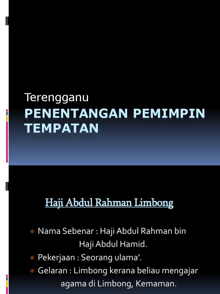 Haji abdul rahman limbong sebab penentangan. Penguatkuasaan undang undang binatang buas peraturan tanah baharu pas kebenaran untuk menjalankan aktiviti pertanian b pada tahun 1992 haji abdul rahman limbong bertindak sebagai peguam untuk membela peeteani di kuala telemong yang ditangkap kerana menentang peraturan baharu. Kelantan diserahkankepada british dan james scott mason penasihat british julai 1909. Dalam perkara ini haji abdul rahman limbong disalahkan sebagai orang yang bertanggungjawab menimbulkan pemberontakan dan penentangan ini. Haji abdul rahman limbong telah mendapat pendidikan awalnya daripada bapa saudaranya iaitu haji tun mohammad zin tun mamat di mekah dan beliau telah menghabiskan zaman kanak kanaknya di mekah.