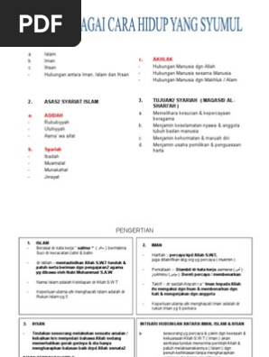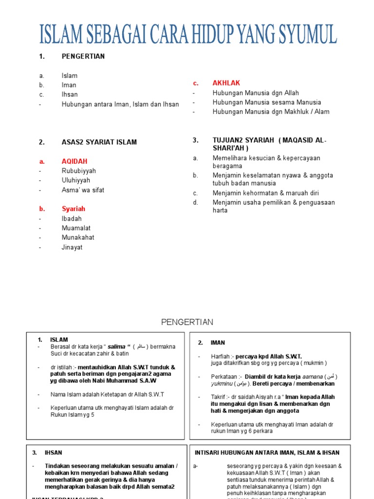 Islam sebagai cara hidup yang syumul. Memberi definisi islam iman dan ihsan. Wahai orang orang yang beriman masuklah islam secara kaffah menyeluruh dan janganlah kamu mengikut jejak syaitan sesungguhnya syaitan itu adalah musuh yang jelas bagi kamu al baqarah. Firman allah di dalam al quran yang bermaksud. Menerangkan maksud aqidah dan syari ah serta dapat menjelaskan maslahah di sebalik setiap suruhan dan larangan dalam islam dapat menyenaraikan ciri ciri keistimewaan islam.