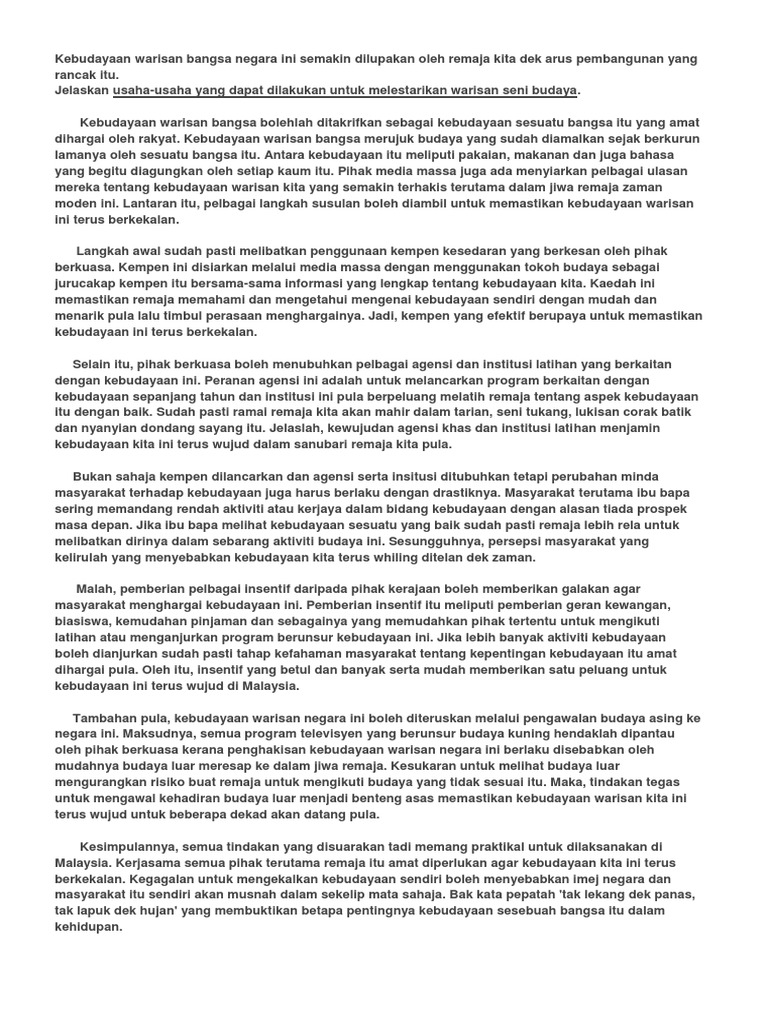 Karangan kepentingan seni dan budaya. Hal ini termasuklah pakaian makanan adat resam seni dan sebagainya. Jadi kita tidak seharusnya beranggapan bahawa seni tersebut tidak lagi sesuai dengan arus pembangunan masa kini dan mengabaikannya hal ini turut disebabkan oleh seni pertahanan diri merupakan warisan budaya yang tidak ternilai harganya dan patut dikekalkan oleh masyarakat. Contoh karangan langkah langkah mencegah wabak covid 19. Kesemua ini amat penting kepada masyarakt bagi menjamin hubungan kaum terus terpelihara dan negara berada dalam keadaan aman dan sejahtera.