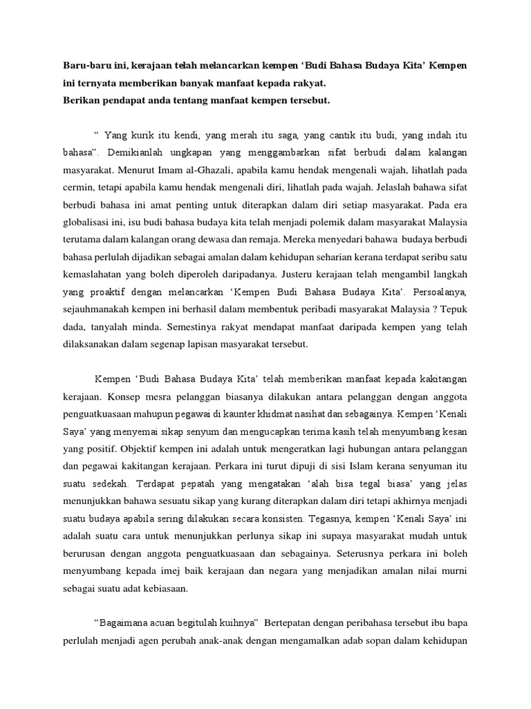 Karangan tentang budi bahasa budaya kita. Masyarakat menilai keperibadian seseorang individu berdasarkan tingginya nilai budi pekerti. Karangan bm spm pt3 pengenalan. Budi bahasa amalan hidup kita ungkapan menarik budi dikaitkan dengan cara bertutur ciri perwatakan yang semestinya melibatkan interaksi sesama manusia di atas buana malaysia yang bertuah ini. Ciri ciri berbudi bahasa juga boleh ditanamkan ke dalam diri golongan pelajar pelajar di sekolah.