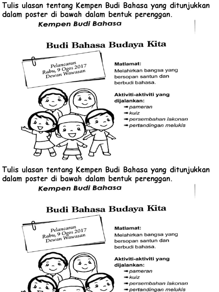 Kempen budi bahasa budaya kita ulasan. Ibu bapa dan orang tua tua dahulu sering menasihati anak anak. Masyarakat yang berbudi bahasa akan saling menghormati antara satu sama lain tanpa mengira kaum warna kulit mahupun agama. Kempen yang dicetuskan oleh dr. Kita mengharapkan agar menjelang tahun 2020 tabiat buruk seperti gengsterisme dan bercakap kesat sudah lupus dari memori setiap rakyat malaysia supaya negara akan lebih cemerlang gemilang dan terbilang.