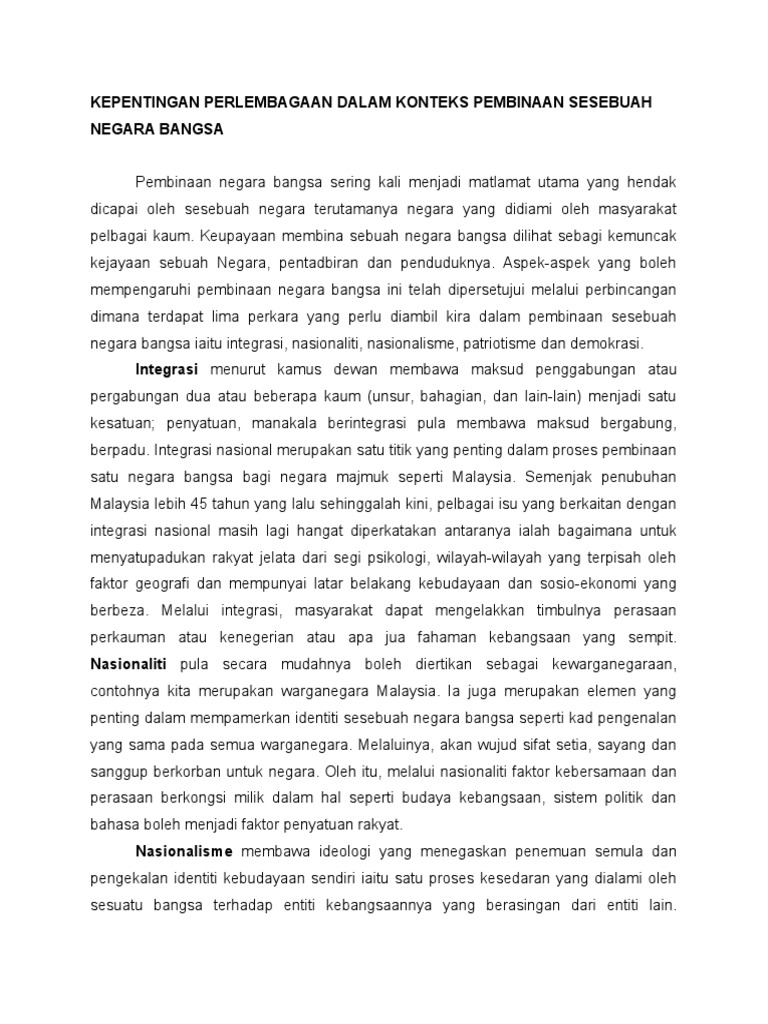 Proses yang perlu dilalui juga adalah panjang berdasarkan perkembangan negara masing masing. Pembinaan negara bangsa 1. Jelas rakyat dan negara kita amat bertuah maruah dan kedaulatan bangsa dan rakyat kita dapat kita lindungi dan kita pertahankan. Cabaran globalisasi ke arah pembinaan negara bangsa1 kesukaran menjadikan malaysia negara maju mengikut acuan sendiri dari segi memperkukuhkan minda budaya dan nilai yang harus menjadi pegangan rakyat supaya sejajar dengan hasrat pembentukan negara bangsa 2 sifat kewibawaan pemimpin negara dalam menyatukan bangsa dan menyeru rakyat menuntut kemerdekaan bangsa agar malaysia mampu menyahut.