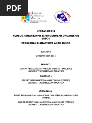 Kertas kerja kursus kepimpinan dan pengurusan organisasi. Peranan guru besar dan pengetua yang semakin mencabar dari sehari ke sehari memerlukan mereka meneliti dan memahami semula isu isu kepimpinan dan pengurusan yang pelbagai. Melalui kursus ini murid murid yang dilantik memegang jawatan akan mampu melaksanakan tanggungjawab mereka dan bersama sama membantu perkembangan kokurikulum di sekolah. Matlamat untuk memastikan murid murid terlibat mempunyai pengetahuan dan kemahiran mengenai kepimpinan dan pengurusan sesebuah organisasi dan mempraktikkannya. The file extension pdf and ranks to the documents category.