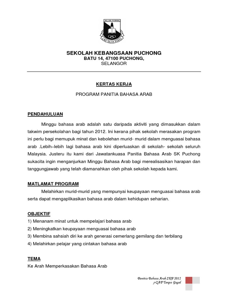 Berikut merupakan koleksi kertas kerja bagi minggu minggu panitia bagi panitia bahasa melayu bahasa inggeris bahasa arab matematik dan sains. Kertas kerja hari bahasa arab sekolah rendah arab jaim merlimau pasir tarikh 13 14 ogos 2007 anjuran panitia bahasa arab sr arab jaim merlimau pasir pendahuluan matapelajaran bahasa arab merupakan satu matapelajaran penting yang wajib dikuasai oleh murid murid sekolah rendah. Program ini melibatkan usaha kolaboratif antara empat bahasa di bawah bidang bahasa yang ditawarkan di sekolah ini iaitu bahasa melayu sebagai bahasa pertama dan bahasa kebangsaan bahasa inggeris sebagai bahasa kedua di malaysia. Program ini dirancang bertujuan untuk memupuk minat dan mencungkil kebolehan murid dalam meguasai bahasa arab.