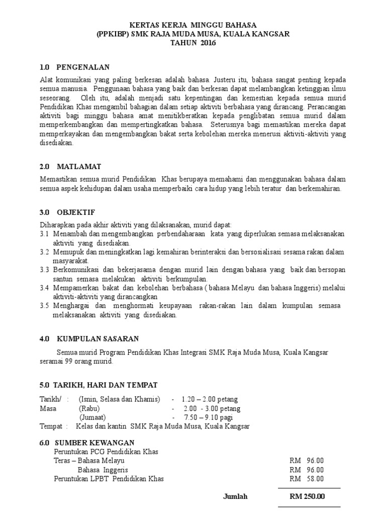 Program akan dijalankan di luar sekolah selama 3 hari 2 malam kertas kerja program inklusif ppkibp. Minggu bahasa peringkat smk pinggan pinggan merupakan satu kesinambungan kepada program bahasa peringkat kebangsaan yang dianjurkan saban tahun. Selaras dengan dasarpendidikan kebangsaanyang termaktubdalam akta pendidikan 1996 bahasa melayu ialah matapelajaran teras semua sekolah rendah dan menengah. Kertas kerja minggu pss minggu bahasa dan kempen galakan membaca sk sungai lui 2020 anjuran pusat sumber sekolah dengan kerjasama panitia bahasa melayu bahasa inggeris bahasa arab pendidikan agama islam pendidikan moral pendidikan jasmani dan kesihatan pemulihan khas dan jalinan kerjasama dengan pusat internet malaysia.