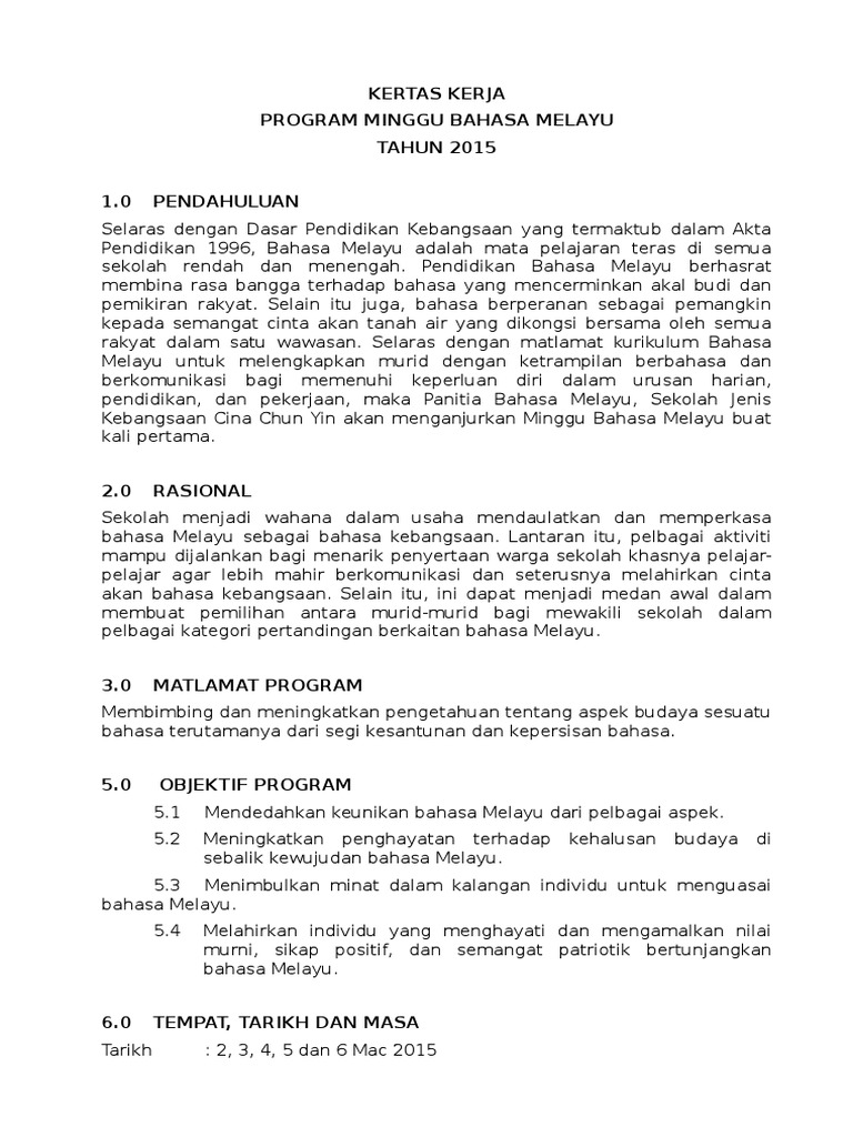 Sepanjang tahun panitia panitia akademik akan merancang pelbagai aktiviti untuk diadakan di sekolah sebagai sokongan kepada akademik murid. Selaras dengan dasarpendidikan kebangsaanyang termaktubdalam akta pendidikan 1996 bahasa melayu ialah matapelajaran teras semua sekolah rendah dan menengah. Berikut merupakan koleksi kertas kerja minggu bahasa melayu untuk dirancang dan dilaksanakan di sekolah anda sebagaia aktiviti tahunana. Kertas kerja minggu bahasa malaysia 1 0 pendahuluan.