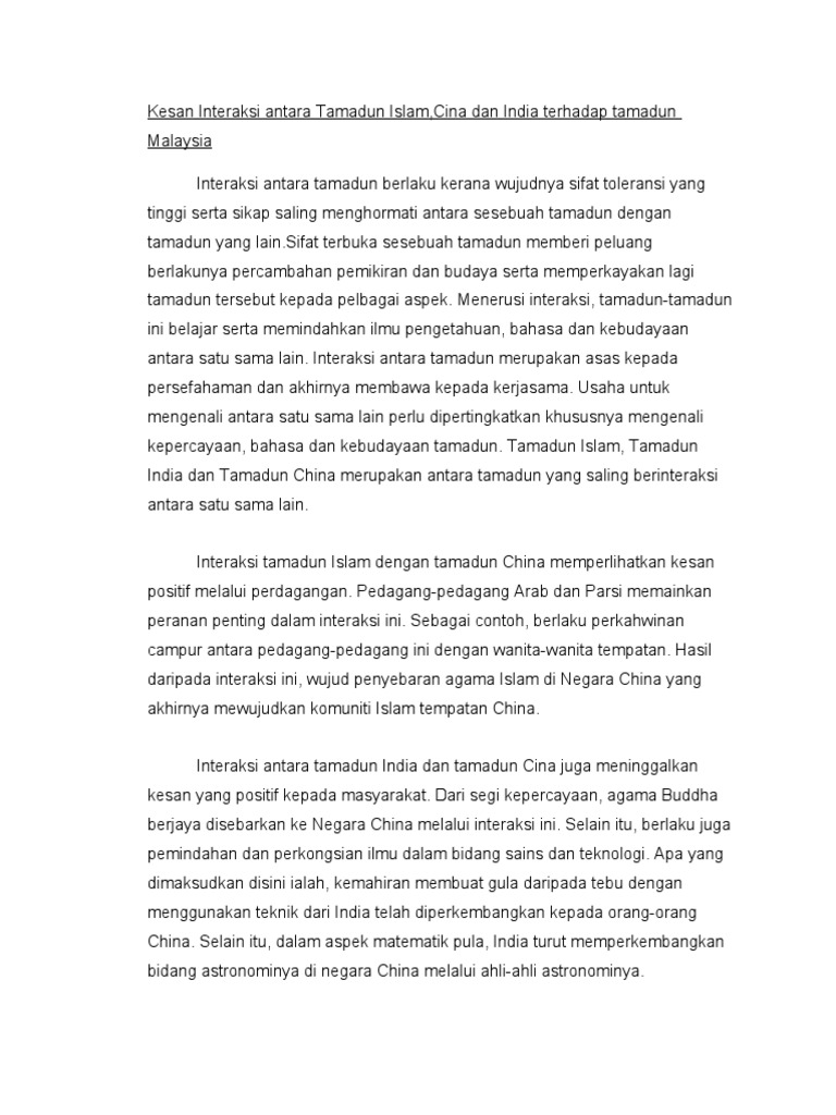Interaksi merupakan hubungan aktif yang saling bertindak balas atau saling mempengaruhi antara satu sama lain. Peribumi melayu mewakili pembina tamadun melayu etnik cina mewarisi tamadun cina dari tanah besar cina dan etnik india mewakili tamadun india dari benua kecil india. Parameswara membalas dengan satu perutusan ke china pada tahun 1405. Interaksi antara pelbagai tamadun faktor dan kesan aina amirah binti nazri 2013899944 amalina arini binti ithnin 2103297216 interaksi sains dan teknologi berlaku apabila perpindahan sains dan teknologi yang dibawa bersama oleh bangsa yang berhijrah.