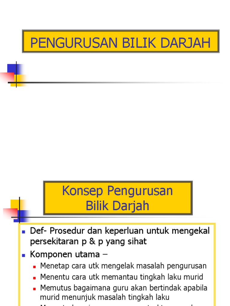 Pengurusan bilik darjah merupakan sesuatu konsep yang komprehensif untuk pelbagai aktiviti guru yang dirancang dengan tujuan memudahcarakan pengajaran dan pembelajaran dalam bilik darjah merangkumi tindakan disiplim rutin harian penyusunan tempat duduk dan memperuntukkan masa pelajaran. Pengurusan bilik darjah adalah satu proses untuk memastikan pelajaran dalam bilik darjah dapat berjalan dengan lancar walaupun pada masa yang sama berlaku gangguan daripada tingkah laku murid. Konsep pengurusan bilikdarjah 2. Pengurusan bilik darjah sebagai orkestra dalam kehidupan di bilik darjah yang memerlukan pembentukan kurikulum penyelenggaraan prosuder dan sumber pengajaran.