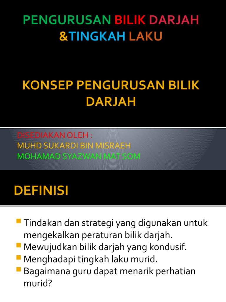 Pendahuluanpengurusan bilik darjahpengurusan bermaksud satu proses mendapatkan penyertaan kerjasama dan campur tangan ahli untuk mencapai objektif objektif organisasi atau kumpulan gerakerjanya termasuk prosesmerancang mengelola memimpin mengarah dan mengawal bilik darjah sebagai tempat. Menurut alberto troutman 1986 dalam haliza hamzah joy nesamalar samuel 2008 di dalam buku yang bertajuk pengurusan bilik darjah dan tingkah laku pengurusan bilik darjah boleh didefinasikan sebagai kemahiran guru menguruskan masa ruang sumber pembelajaran peranan dan tingkah laku murid dalam menyediakan suatu iklim yang sesuai untuk pembelajaran. Konsep pengurusan bilik darjah 1. Ia juga dapat menjimatkan masa dan tenaga.