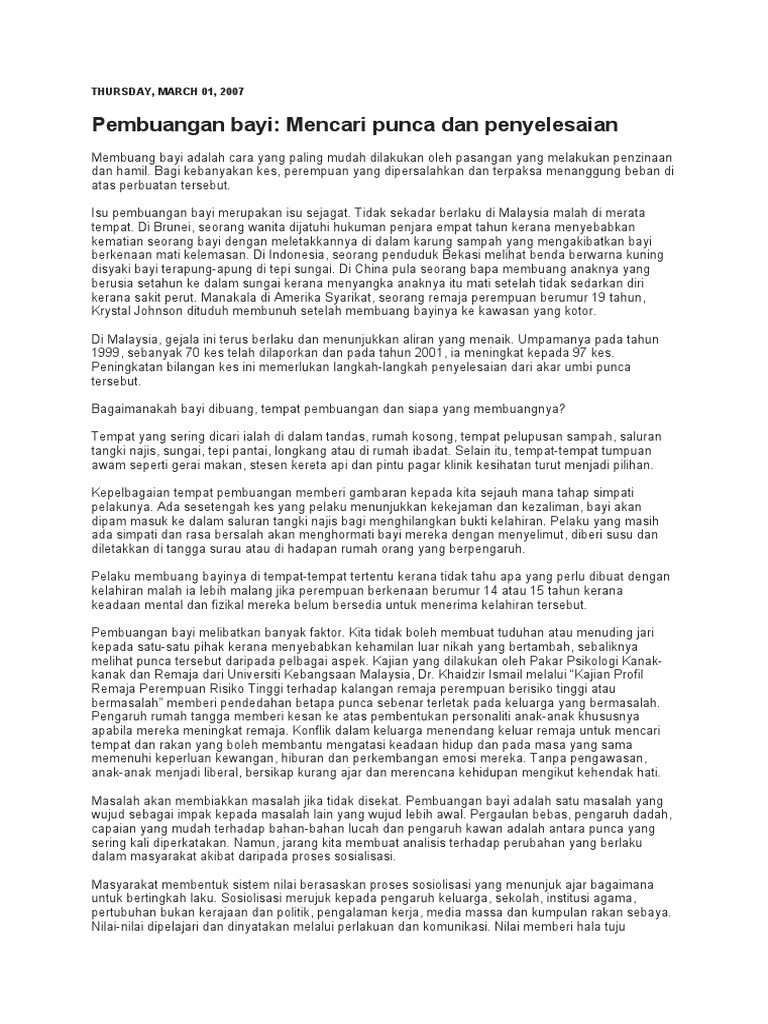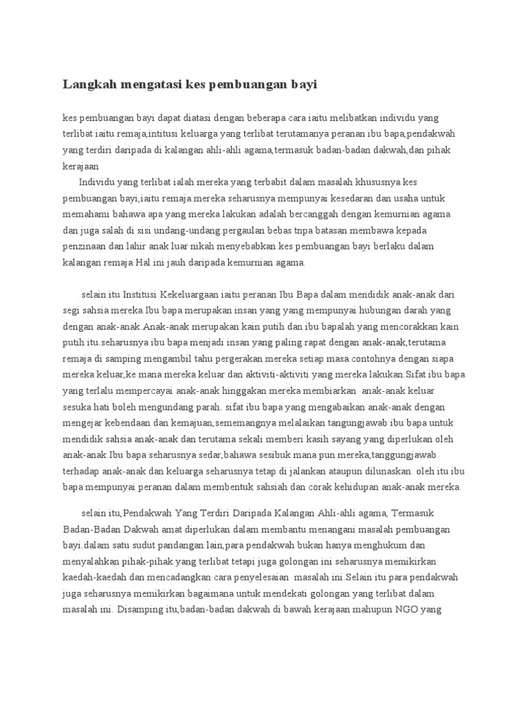 Dalam mengejar arus pemodenan kemelut pembungan bayi tidak harus dipandang sepi pihak berkuasa dan media massa haruslah memainkan peranan untuk mengatasi masalah ini. Langkah langkah mengatasi masalah penderaan kanak kanak dan masalah pembuangan bayi 2 25 pg esei dalam meniti kehidupan pada marcapada ini gejala pembuangan bayi dan penderaan kanak kanak amat berleluasa di negara kita malaysia. Bagi membendung masalah masalah seperti ini daripada terus menular dalam kalangan golongan yang tidak bertanggungjawab ini masyarakat sendiri haruslah memainkan peranan mereka untuk membantu mengatasi gejala gejala tersebut. Kes pembuangan bayi dapat diatasi dengan beberapa cara iaitu melibatkan individu yang terlibat iaitu remaja intitusi keluarga yang terlibat terutamanya peranan ibu bapa pendakwah yang terdiri daripada di kalangan ahli ahli agama termasuk badan badan dakwah dan pihak kerajaan individu yang terlibat ialah mereka yang terbabit dalam masalah khususnya kes.