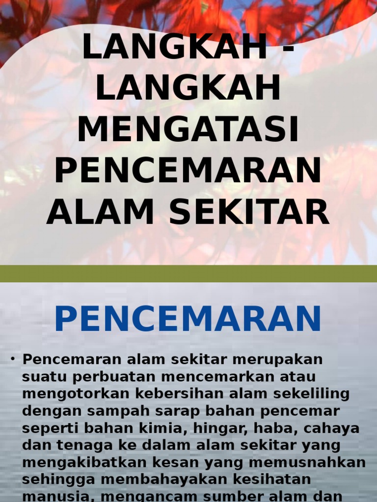 Langkah mengatasi pencemaran alam sekitar pdf. Hal ini kerana pencemaran alam sekitar didapati telah bertambah dari semasa ke semasa. Menguatkuasakan undang undang untuk mengawal pembebasan gas gas beracun dari kilang kilang dan kenderaan. Langkah langkah mengatasi masalah pencemaran alam sekitar pembangunan tanpa batasan merupakan perubahan kian pesat yang berlaku di negara kita pada alaf globalisasi ini. Salah satu langkah yang perlu diambil untuk menangani masalah pencemaran alam sekitar ialah mengurangkan penggunaan bahan kimia.