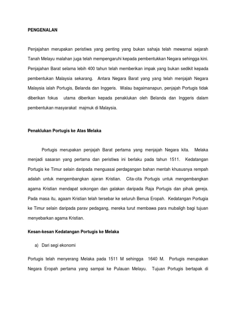 Hal ini berubah pada tahun 1409 apabila parameswara berkahwin dengan puteri dari pasai agama islam dijadikan sebagai agama rasmi kesultanan. Latar belakang kesultanan melayu melaka menurut kesultanan melayu melaka parameswara yang dilahirkan sebagai dharmaraja adalah raja singapura terakhir yang berasal dari keturunan srivijaya. Assalamualaikum dan selamat sejahtera ini adalah sebuah blog baru yang bakal diedit oleh 6 pelajar mahasiswa politeknik merlimau melaka bagi tugasan e folio kami tujuan blog ini dibina adalah bagi memaparkan kisah dan sedikit info tentang kedatangan portugis ke melaka kalau tak kenal maka tak cinta izinkan kami memperkenalkan diri kami kita bermula dari yang berdiri disebelah kiri sekali nama. Raja portugis berusaha sedaya upaya untuk menakluki melaka dengan melakukan pelaburan yang tinggi.