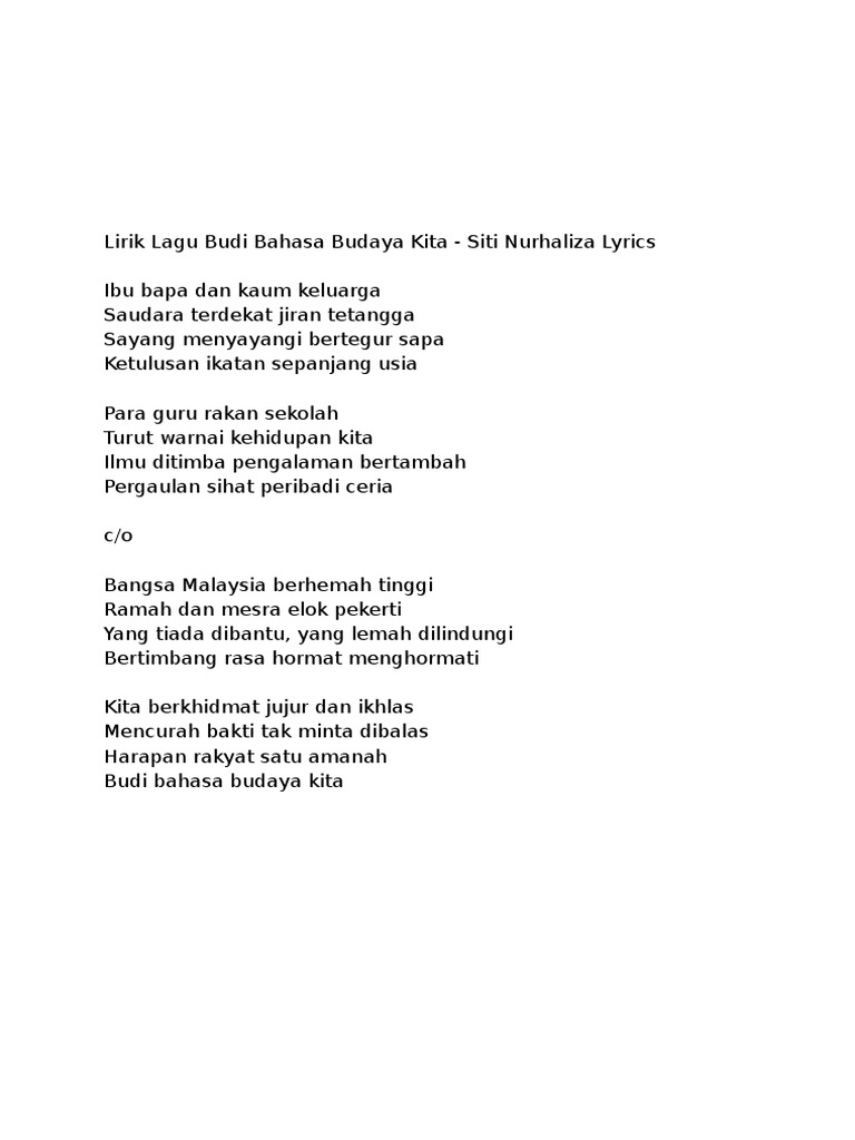 Dibawah ini saya akan nyatakan lirik lagu dan maksudnya sekali. Tingkah laku yang bersantun ini haruslah diikuti oleh masyarakat malaysia. Lirik lagu budi bahasa budaya kita 1. Zehra zambri siti nurhaliza ciptaan.