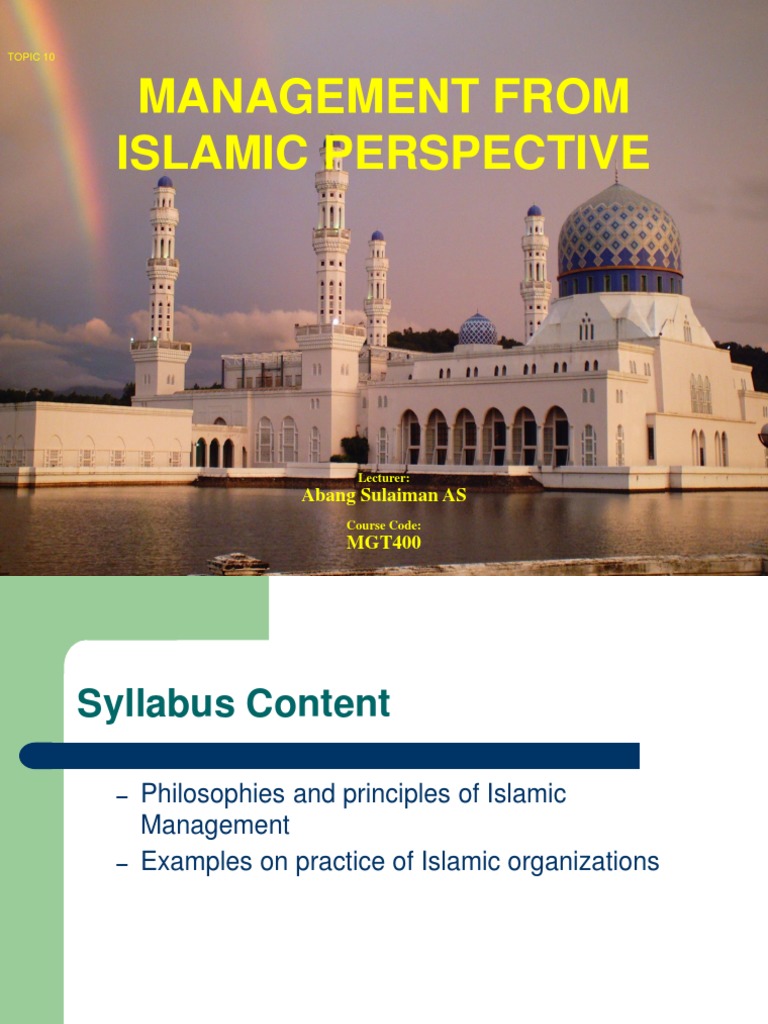 Management from islamic perspective mgt400. The islamic way of managing things has been practiced since the era of prophet muhammad saw based on the teaching of al quran and as sunnah norchahaya johar fpp uitmt. The practice of consensus. An introductory book on management from an islamic perspective. The islamic approach to management the islamic approach to management is an emerging discipline often referred to as islamic management looks at the management of organizations from the perspective of the knowledge from the revealed sources and other islamic sources of knowledge and results in applications compatible with the islamic beliefs and practices.