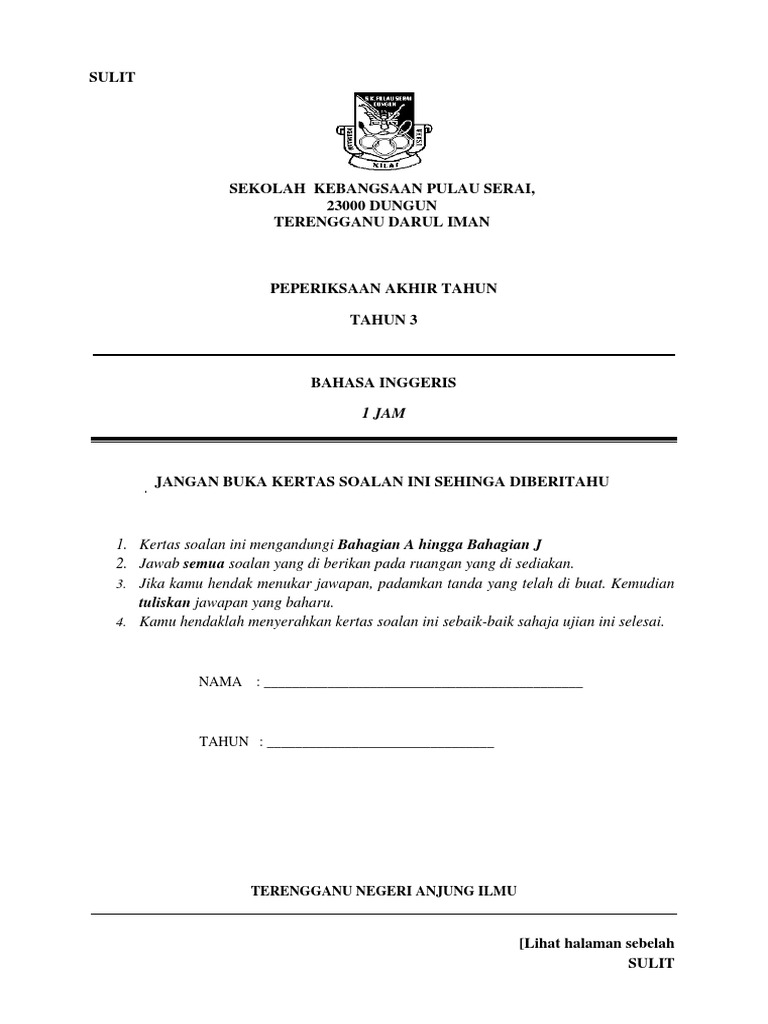 Ujian akhir tahun tahun 4. Bahasa inggeris pendidikan jasmani dan pendidikan kesihatan. Sila muat turun muka depan soalan untuk kegunaan peperiksaan pertengahan tahun dan uppm 2 mei 2016. Kulit soalan rasmi mt sn sekolah.