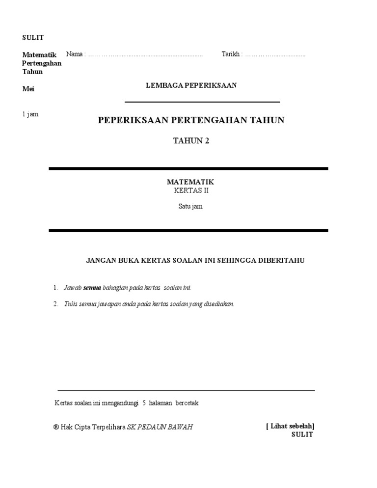 Muka depan soalan peperiksaan akhir tahun. Peperiksaan pertengahan semester dua matematik kertas 1 jangan buka kertas soalan ini sehingga diberitahu 1. Kulit soalan rasmi bahasa sekolah. Bank soalan peperiksaan akhir tahun tingkatan 2 adalah antara himpunan soalan soalan yang berjaya kami sediakan untuk menjadi panduan dan rujukan kepada guru dan pelajar. Untuk tindakan guru matapelajaran.