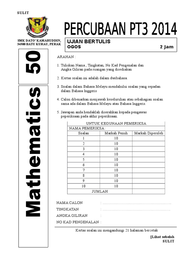 Mesyuarat unit penilaian dan peperiksaan bil 1 2019. All materials on our website are shared by users. Peperiksaan pertengahan semester dua matematik kertas 1 jangan buka kertas soalan ini sehingga diberitahu 1. Muka dpn spm muka depan pt3.