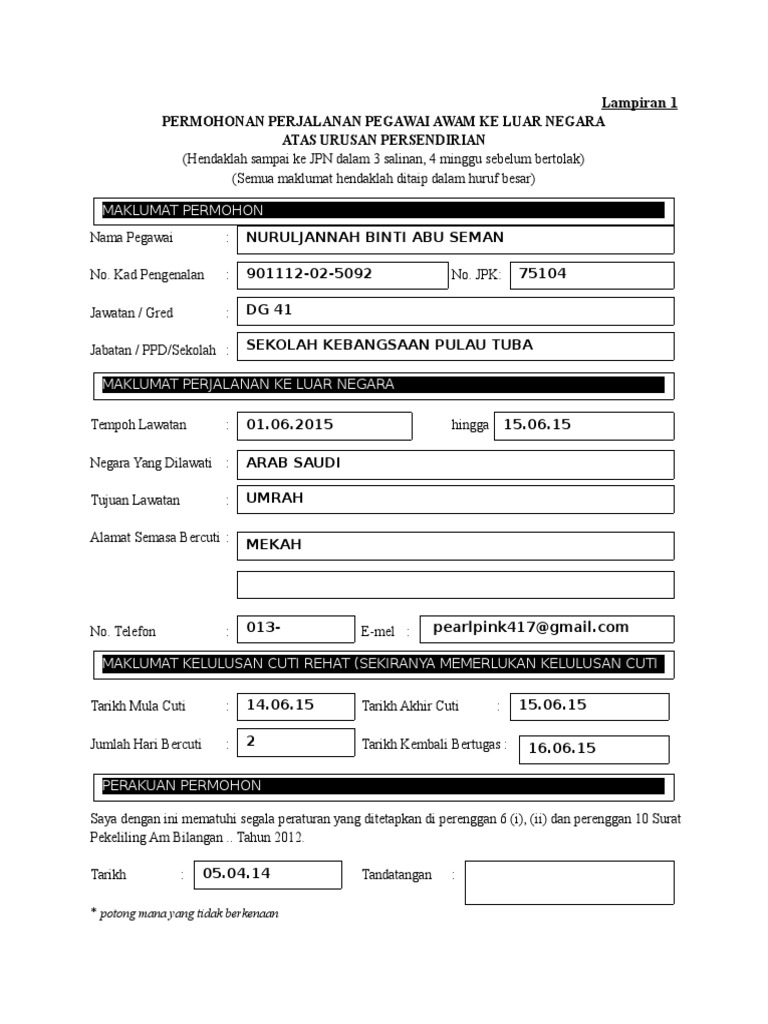 4 3 bagi lawatan rasmi ke luar negara yang melibatkan murid jumlah guru pengiring adalah mengikut nisbah 5 murid. 8 6 pekeliling perbendaharaan pb 3 3 garis panduan langkah langkah mengoptimumkan perbelanjaan kerajaan 8 7 pekeliling perkhidmatan bilangan 6 tahun 2015 bertajuk kemudahan. Permohonan keluar negara atas urusan persendirian mengikut surat pekeliling am bil 3 tahun 2012 perhatian. Permohonan keluar negara atas urusan persendirian ini hendaklah diisi dua 2 minggu sebelum pemohon keluar negara.