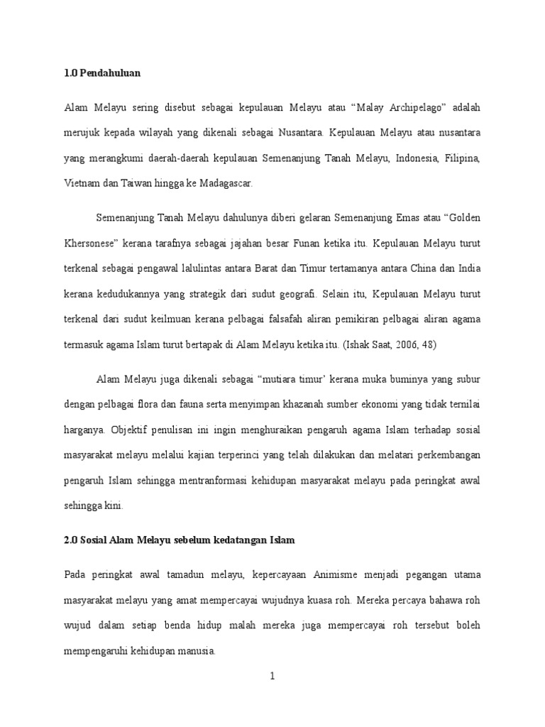 Pengaruh islam di alam melayu pendahuluan alam melayu sering juga disebut sebagai kepulauan melayu atau malay archipelago adalah merujuk kepada wilayah yang dikenali sebagai nusantara. Pengaruh islam dalam pemerintahan masyarakat melayu melaka sebelum penjajahan asing 1400 l51l merupakan salah satu khazanah penting dalam sejarah asia tenggara. Seni bina masjid termasuk di dalam seni bina bangunan yang penting di malaysia. Di antara cara hidup yang terpenting yang berhubung rapat dengan ad din ialah masjid abdul rahman 1981.