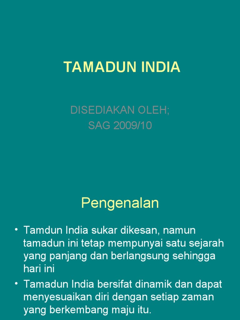 Sejarah tamadun india sejarah tamadun india 1 pengenalan tamadun india adalah sebuah tamadun unggul yang tertua di dunia dan mempunyai keunikannya course hero. Lahirnya tamadun mohenjodaro dan tamadun harappa yg terletak di satu wilayah yg luas antara india dan pakistan. Kekuatan tamadun ini bergantung kepada beberapa faktor antaranya. Pengenalan kepada tamadun india tamadun ini wujud antara tahun 2500 1800 s m selepas tempoh ini tamadun indus telah mengalami keruntuhan.