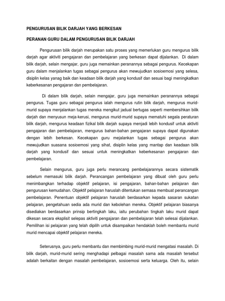 Pengurusan bilik darjah dan tingkah laku yang berkesan bercirikan pengurusan yang cemerlang. Pengurusan bilik darjah dinamik ke arah pembinaan modal insan berkualiti pendahuluan. 1 pengurusan bilik darjah mohd hasani dali universiti utara malaysia kedah mohamad johdi salleh international islamic university malaysia pendahuluan. Faktor utama dalam menguruskan tingkah laku di dalam bilim darjah menurut kounin adalah berkaitan dengan kebolehan guru untuk mengawasi semua perkara yang berlaku di dalam bilik darjah. Susunan peralatan dan kemudahan dalam bilik darjah seperti kerusi meja buku rujukan pusat pembelajaran bakul sampah papan tulis dan lain lain akan membantu keberkesanan proses pengajaran dan pembelajaran serta mengekalkan disiplin murid murid dalam bilik darjah.