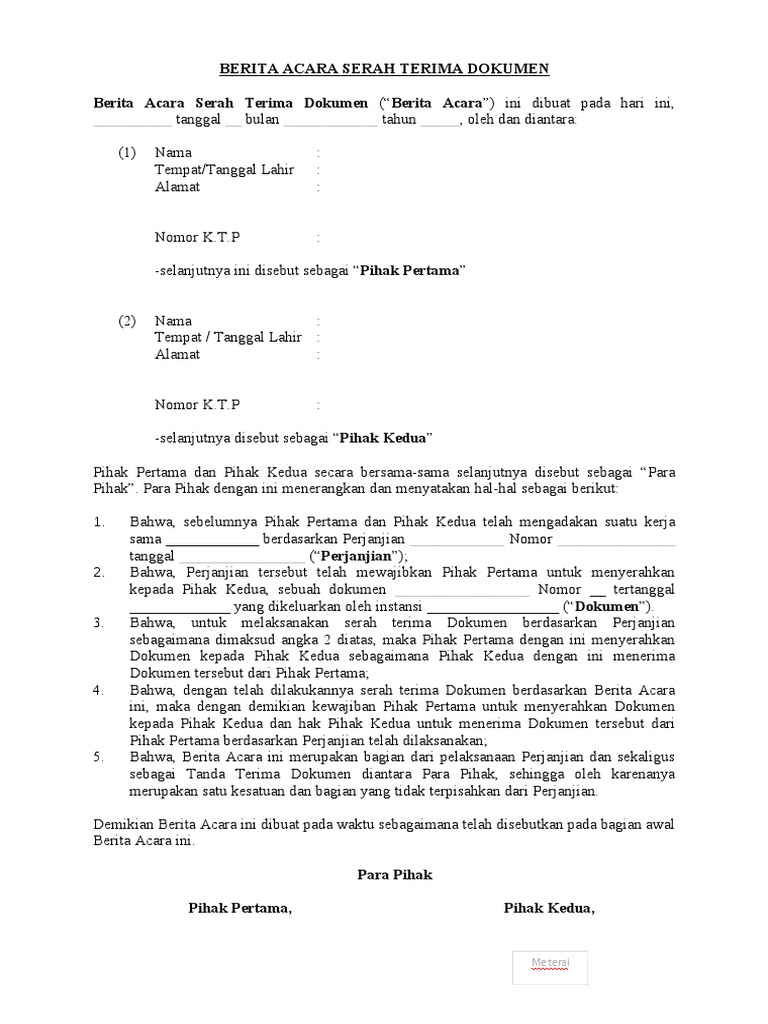 Penyerahan contoh surat serah terima dokumen. Baik itu berupa uang dokumen barang ataupun hal lainnya. Halo sobat nehanesia apakah anda sedang mencari contoh surat berita acara serah terima barang. Dibawah ini adalah contoh berita acara serah terima dokumen yang bisa dijadikan sebagai referensi. Sehingga bila suatu saat terjadi perselisihan maka berita acara tersebut dapat dijadikan alat pembuktian penyerahan barang.