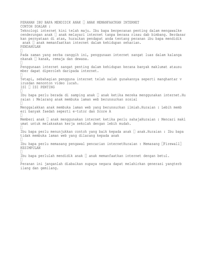 1 0 peranan ibu bapa dalam membentuk anak anak peranan ibu bapa adalah besar untuk mendisiplinkan anak anak. Hal ini disebabkan anak anak perlu diberitahu mengenai baik buruk penggunaan internet sebelum mereka didedahkan dengan cara menggunakan kemudahan internet secara bijak. Yang ini contoh karangan khas untuk semua budak pmr 09. Sebagai ibu bapa yang bertanggungjawab mereka mestilah menetapkan masa penggunaan internet dalam kalangan anak anak.