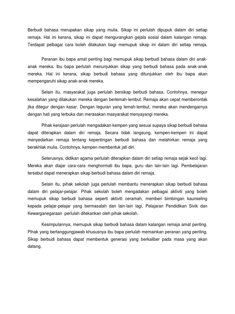 Jadi apa kata ikuti panduan untuk membentuk budi bahasa dalam diri anak anak dan anda sebagai boleh ibu bapa suatu hari nanti boleh berbangga dengan hasilnya. Orang yang merendah diri dan berhemah tinggi lebih mudah membimbing anak menjadi insan yang luhur hatinya kerana proses tarbiyah itu berlaku bukan hanya secara lisan tetapi juga berterusan kerana ibu bapa menjadi mentor yang paling dekat di hati anak untuk dicontohi. Jikalau anak anak kini berjaya membentuk keperibadian yang mulia sudah tentu anak remaja yang merupakan pemuda harapan bangsa pemudi tiang negara ini dapat menjadi pemimpin. Dalam usaha untuk meningkatkan kesantunan berbahasa di negara kita ibu bapalah yang memainkan peranan yang penting untuk mendidik anak anak sejak kecil dengan adanya didikan ibu bapa maka anak akan memiliki amalan budi bahasa dalam diri sendiri mereka selain itu ibu bapa juga harus menunjukkan teladan yang baik kepada anak anak mereka contohnya apabila ibu bapa menghormati orang tua di hadapan.