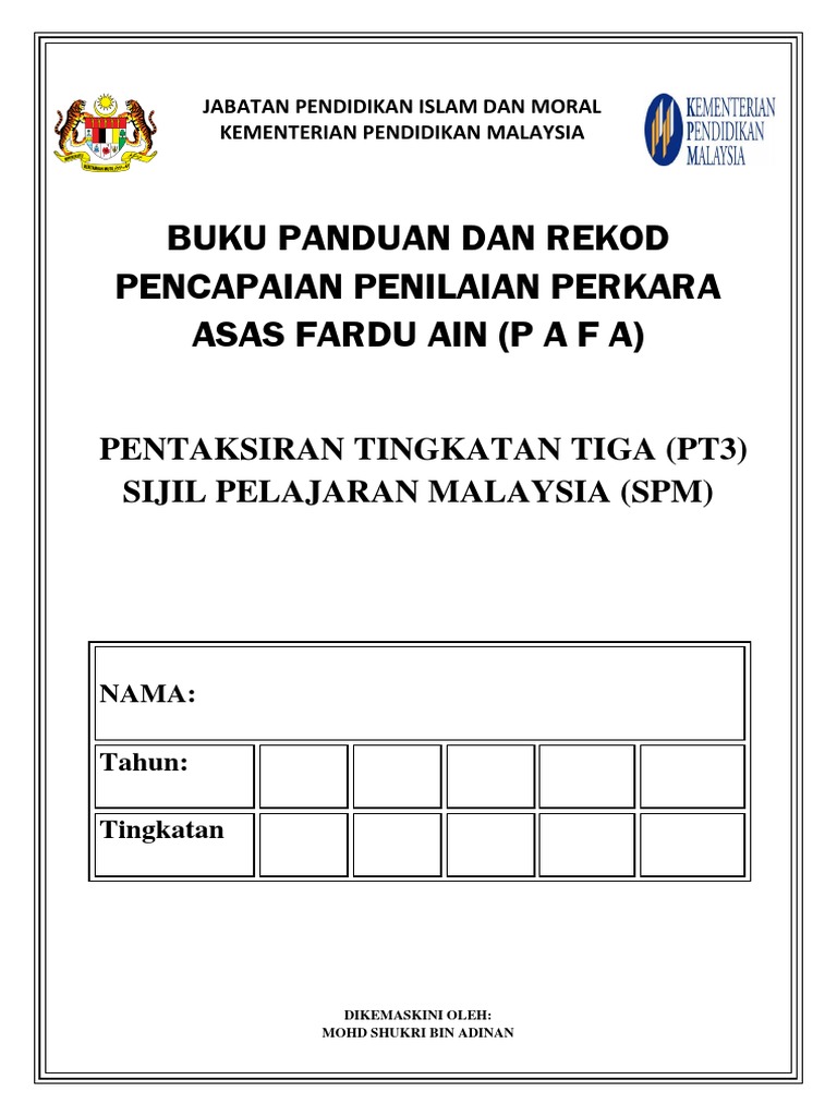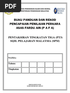 Penilaian asas fardu ain pafa 1 penilaian asas fardu ain pafa 2 perkara asas fardu ain pafa beberapa perkara asas fardu ain yang terkandung dalam sukatan pelajaran pendidikan islam yang ingin dipastikan benar benar diketahui difahami di amalkan dan dihayati oleh setiap murid dengan betul dan sempurna sebagaimana yang telah ditetapkan oleh syarak 3 tujuan penilaian pafa. Hanya perlu print dan photostat. Buku ini memberikan satu penyelesaian dalam usaha memahami serta mengamaikan perkara perkara yang berkaitrapat dengan fardhu ain. Penilaian perkara asas fardhu ain pdf indahnya hidup bersyariat 2 modul fardu ain diri keluarga dan masyarakat.