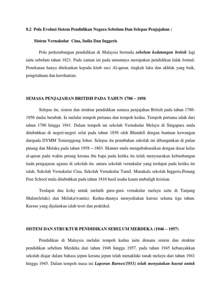 Perkembangan pendidikan di malaysia sebelum merdeka laporan barnes. Kronologi perkembangan pendidikan di malaysia erra priska michael 1 perkembangan pendidikan di malaysia sebelum merdeka sekolah pondok pendidikan tidak formal pengajaran kitab suci al quran tingkah laku dan akhlak yang baik pengetahuan dan juga sifat kerohanian. Laporan barnes 1950 a disediakan pada tahun 1951 oleh l j. Cadangan menghapuskan sekolah sekolah vernakular dan menggantikan dengan sekolah dwibahasa. Cadangan laporan ini ialah.